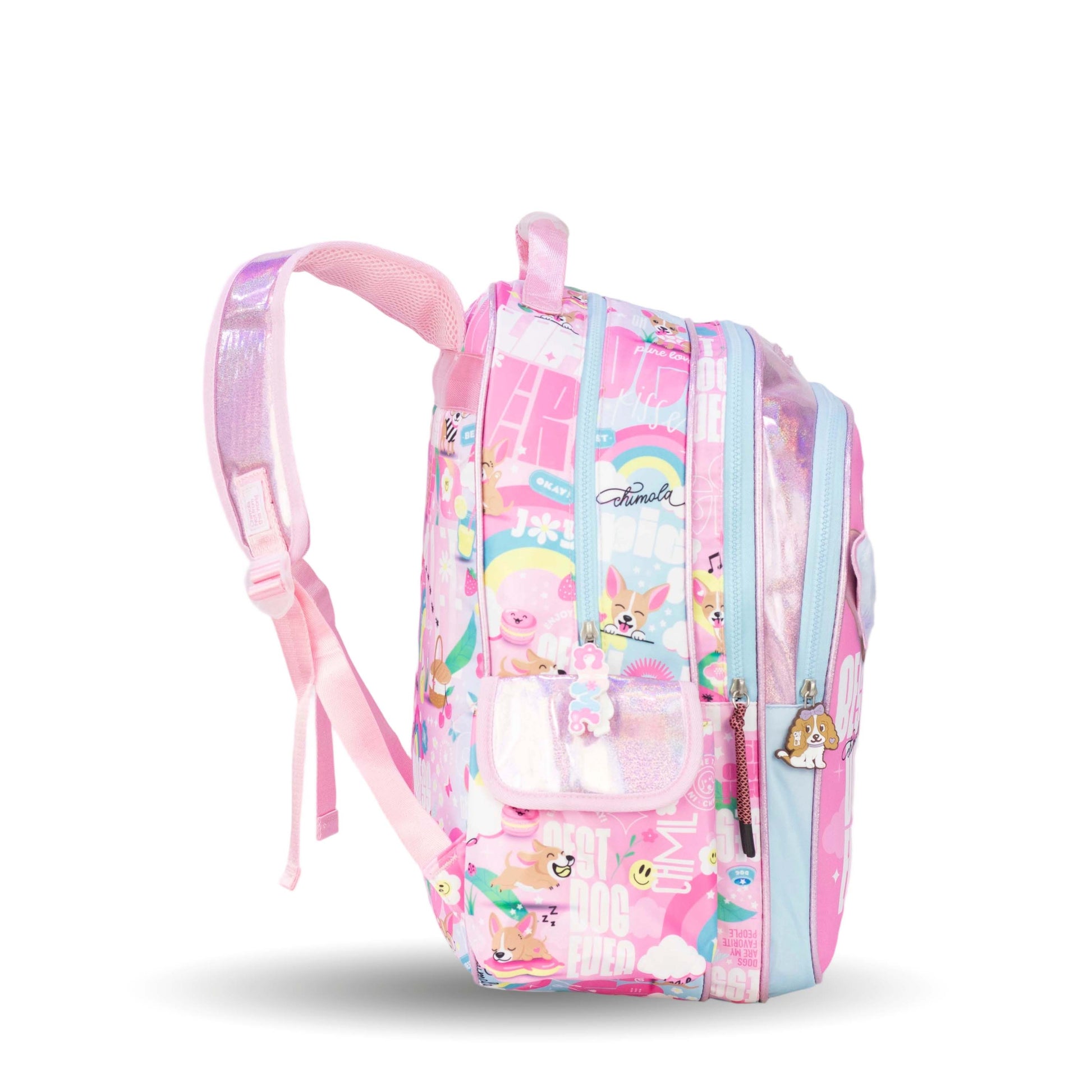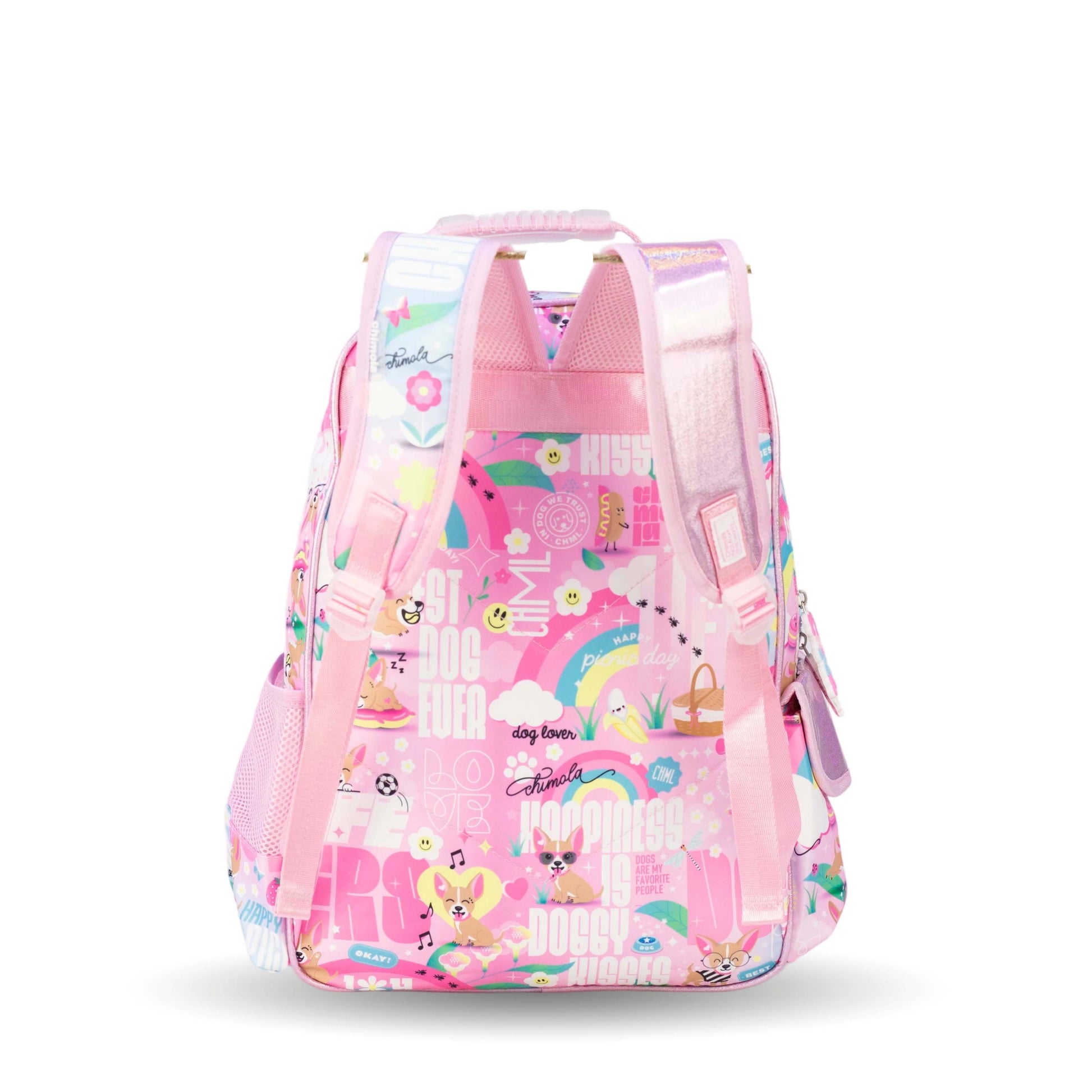 MM039 حقيبة ظهر تشيمولا للأطفال، تصميم كلب جميل، وردي مع قوس قزح، متعددة الجيوب، مع نقوش عصرية
