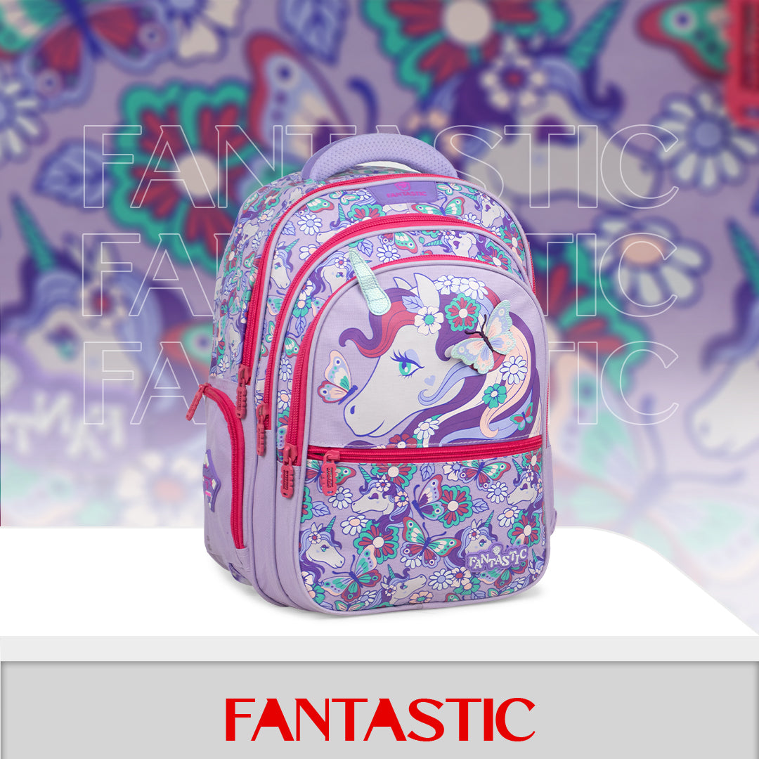 QY001 حقيبة ظهر مدرسية للأطفال، تصميم يونيكورن وفراشات، ٣ حجرات، ٢٥ لتر، مقاومة للماء، بنفسجي، 40×30×15 سم
