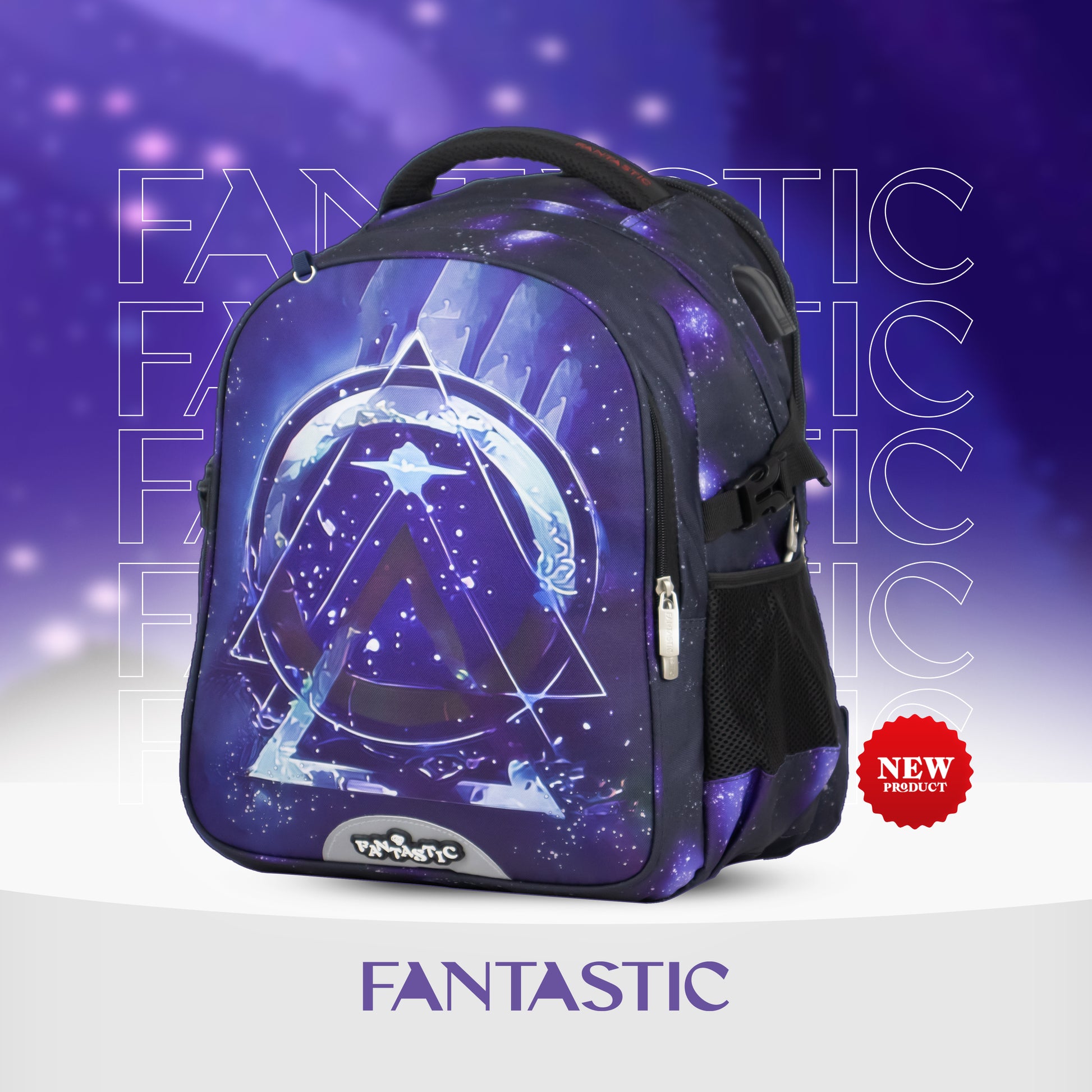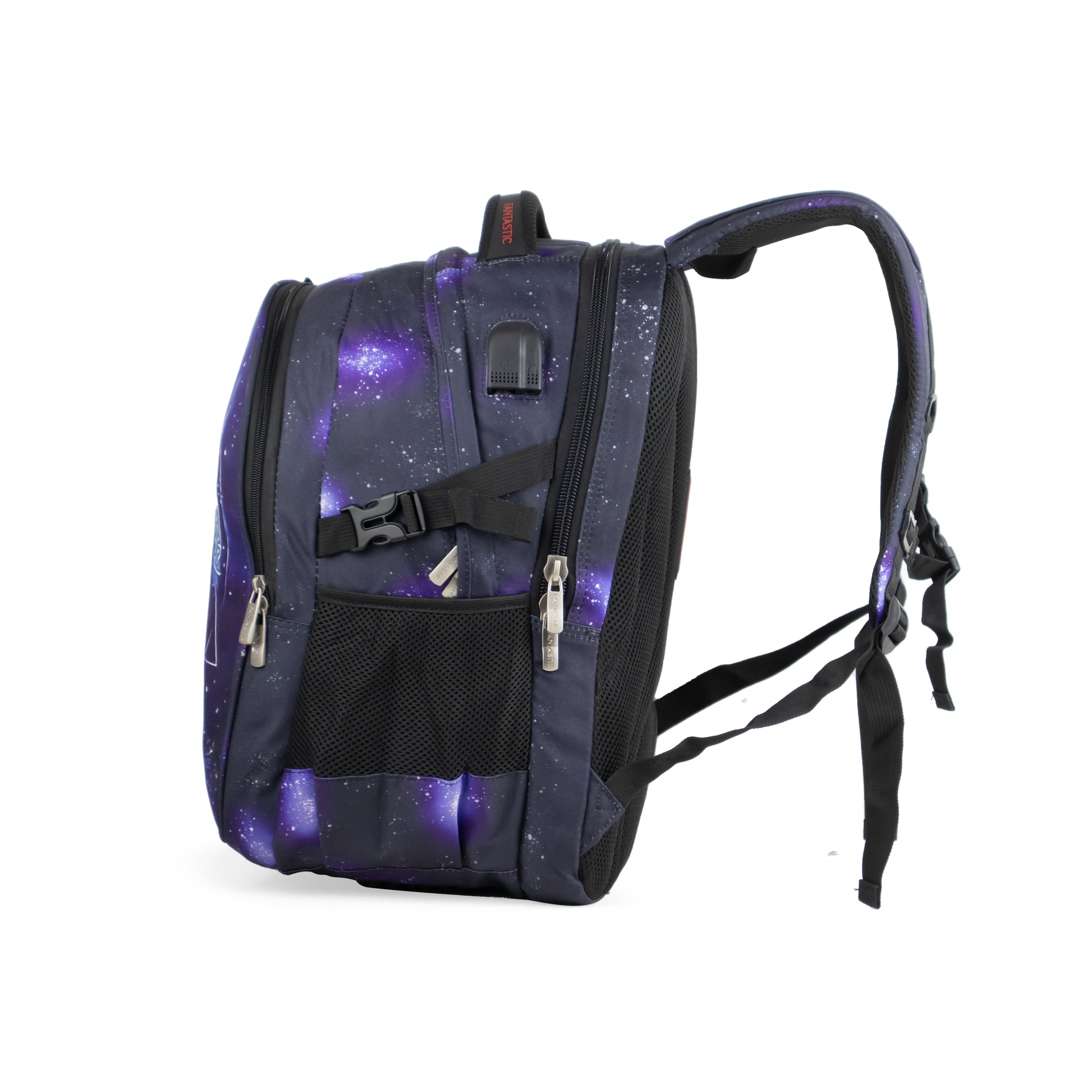 تصميم عصري: حقيبة ظهر بنفسجية جذابة مع تصميم فني مميز للفضاء والنجوم، مثالية للمدرسة والاستخدام اليومي