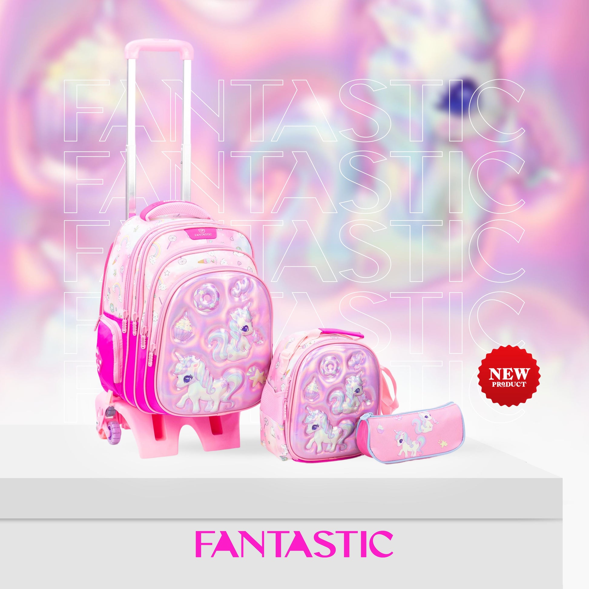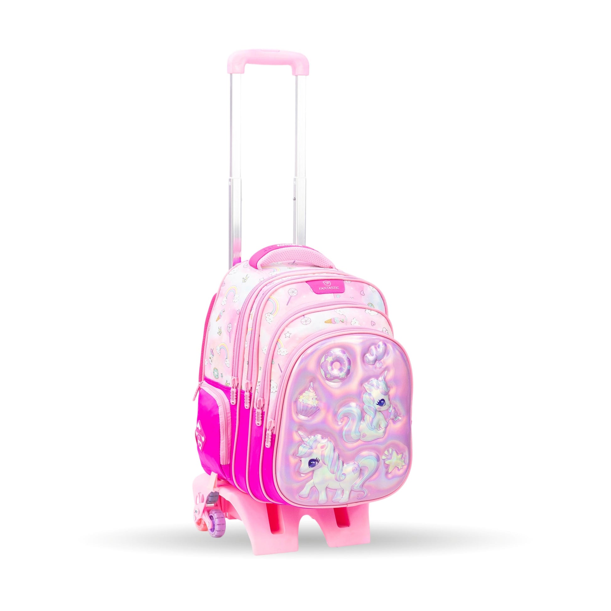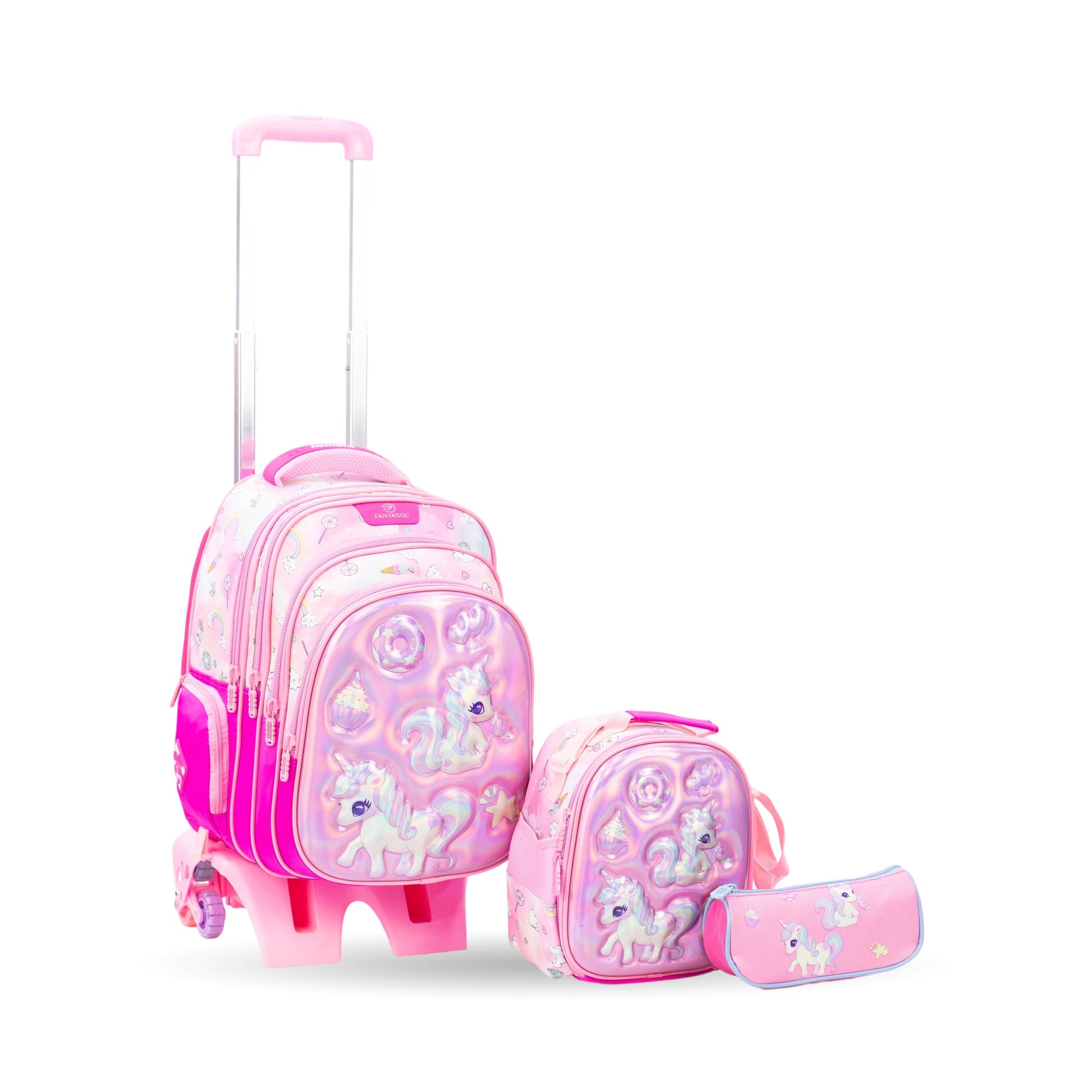 QY008T حقيبة مدرسية فانتاستيك للأطفال مع عجلات ، طقم ٣ قطع، حقيبة ظهر يونيكورن مع حقيبة طعام ومقلمة، وردي