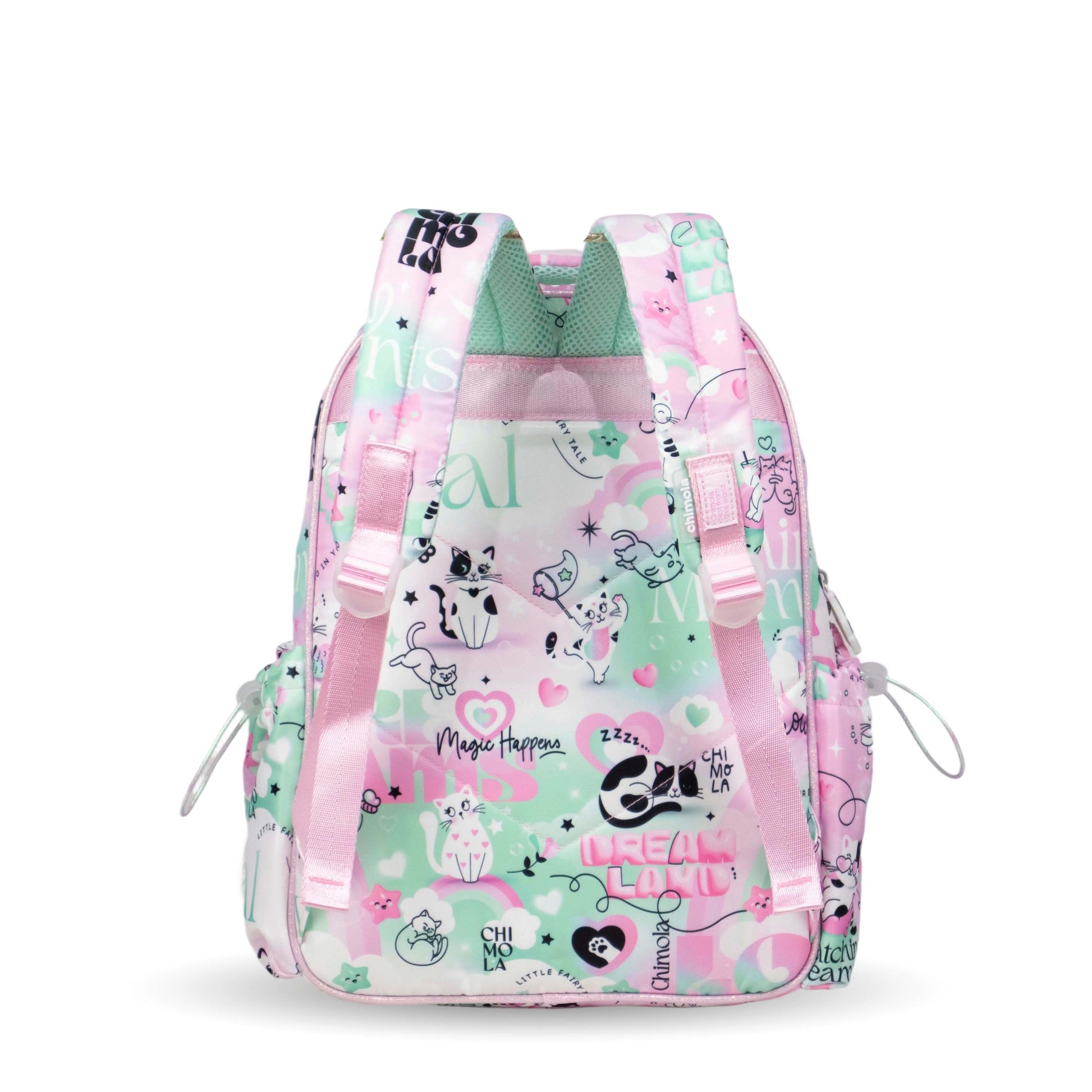 MM044 شنطة ظهر للأطفال بتصميم قطة، لون وردي ومنت، مع جيوب متعددة وتفاصيل براقة