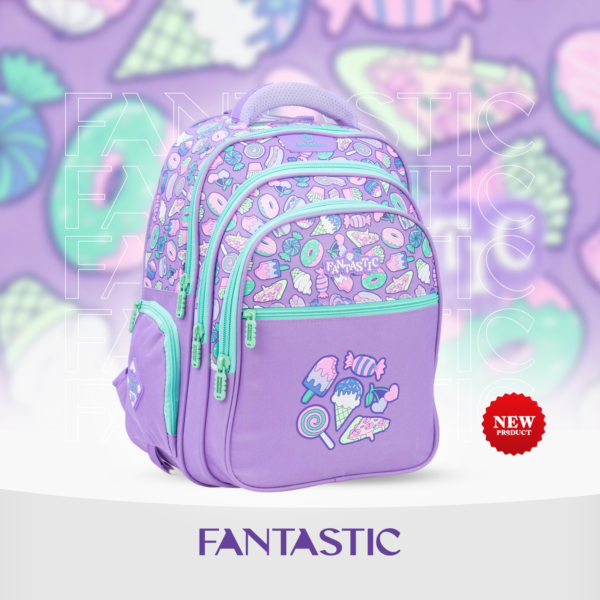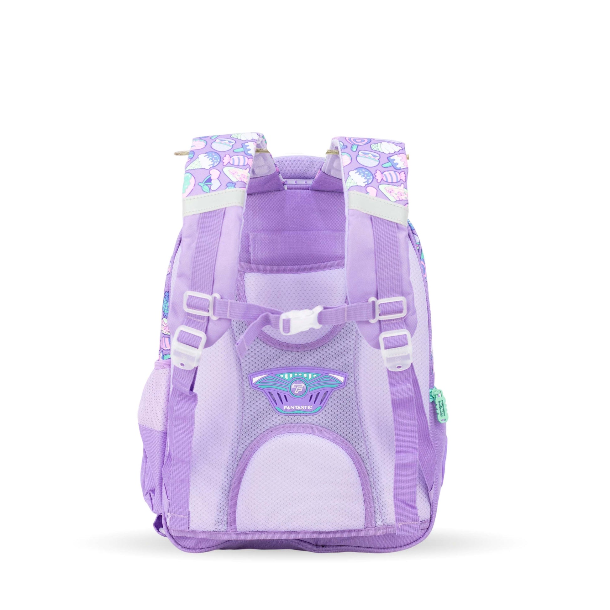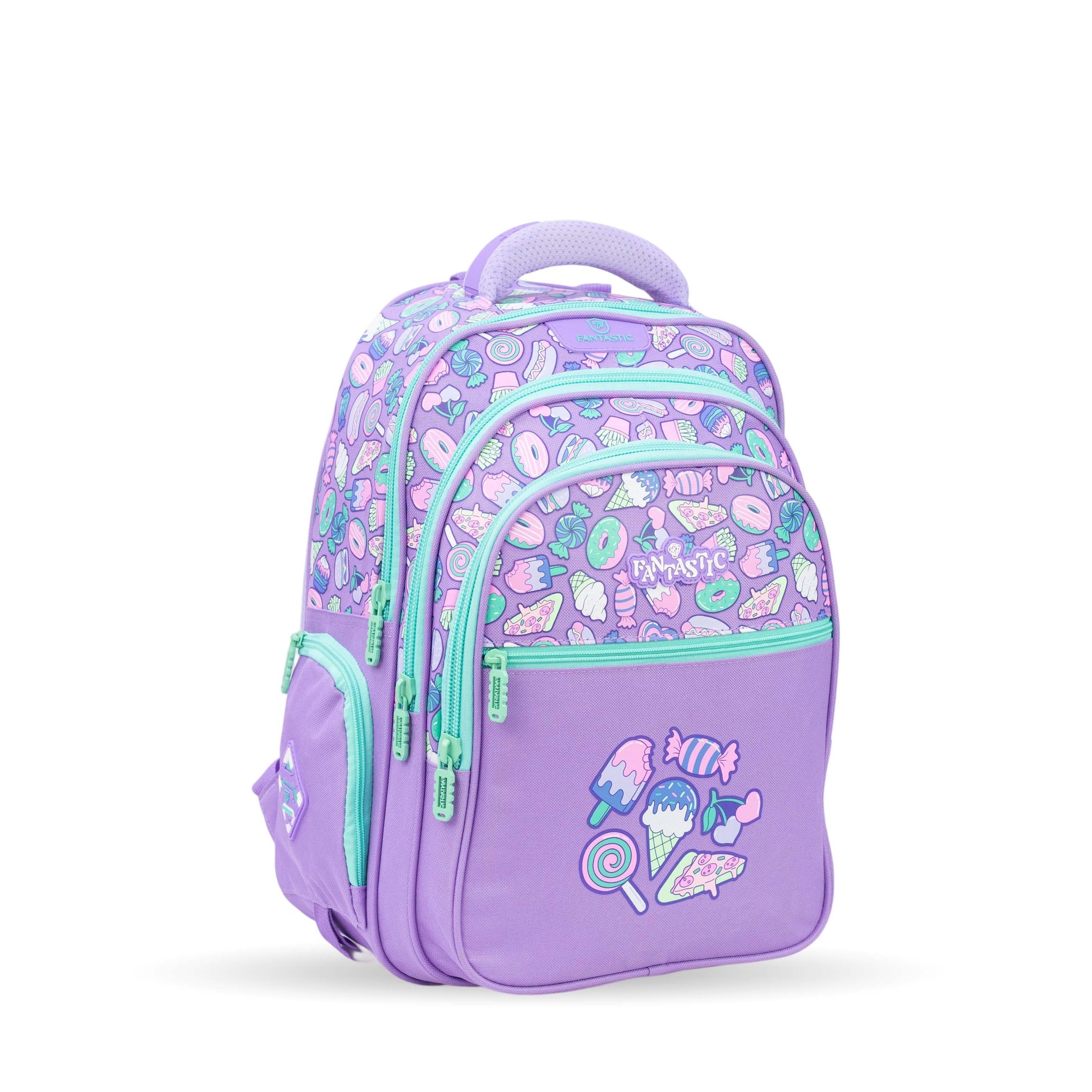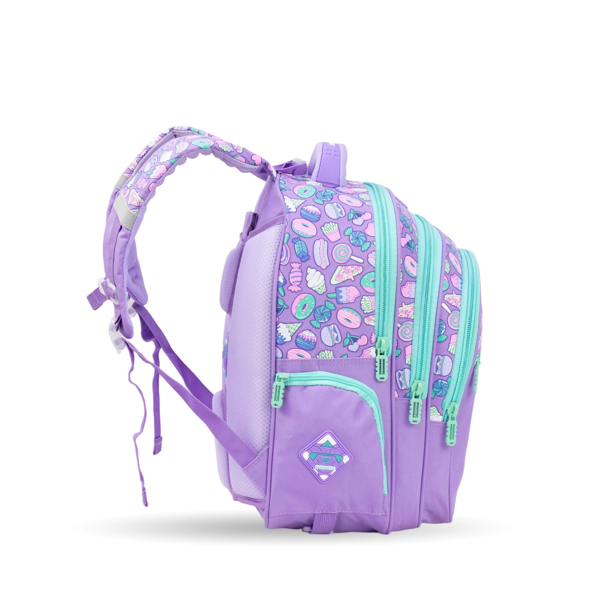 فانتاستيك حقيبة ظهر مدرسية، تصميم حلويات، لون بنفسجي مع أزرق فاتح، سحابات متعددة QY002
