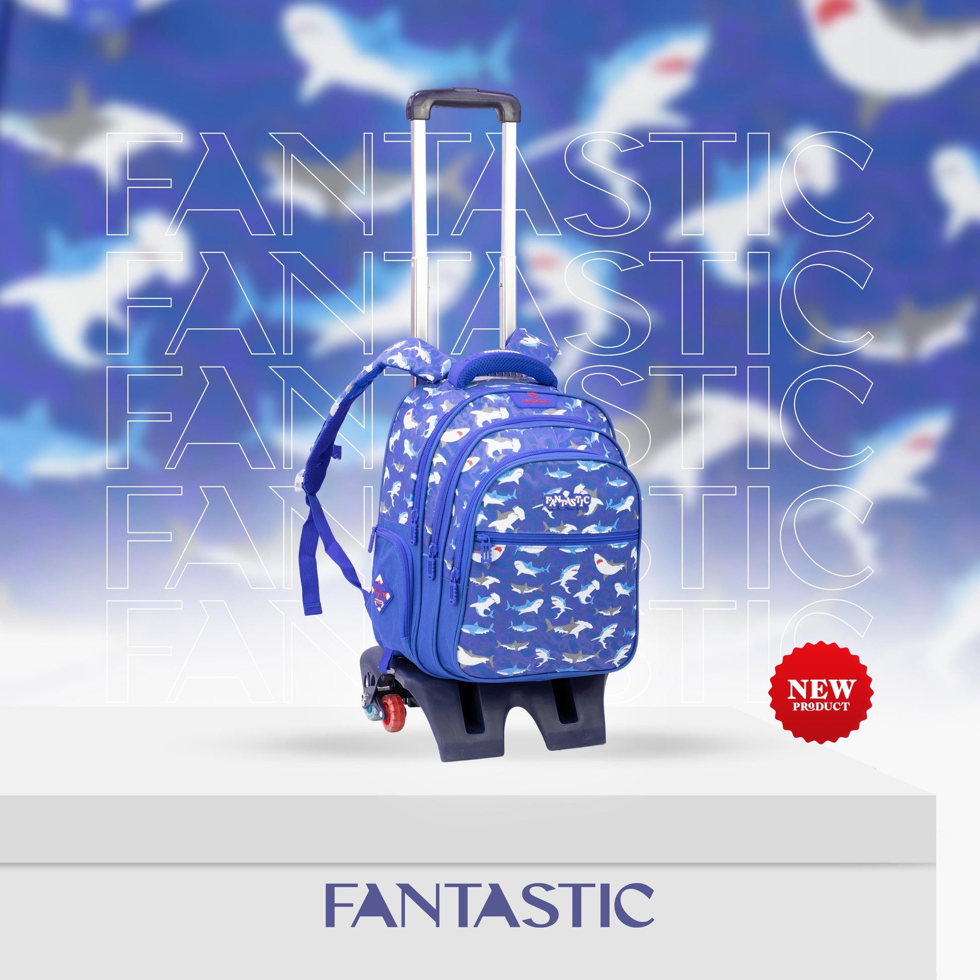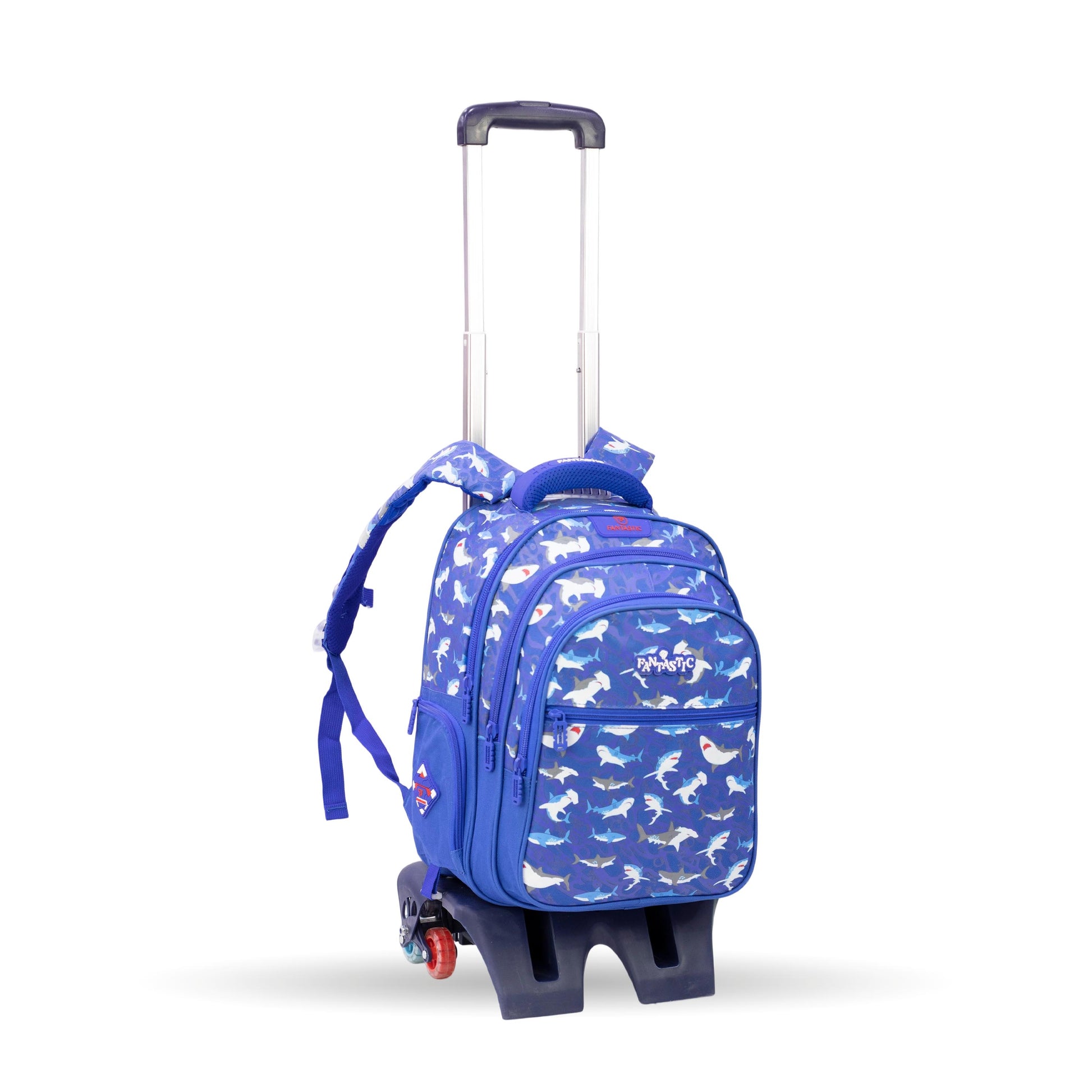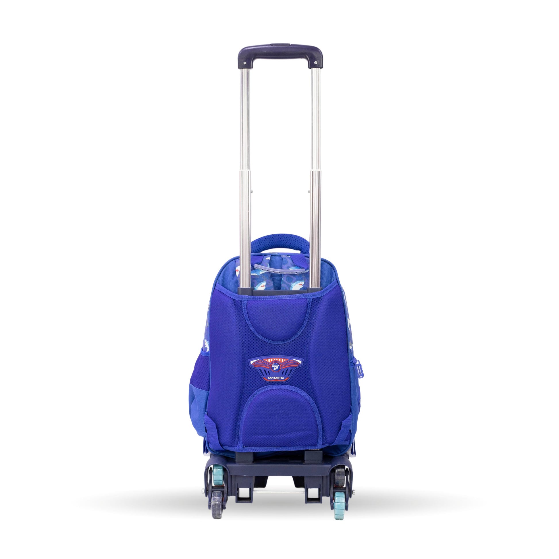 فانتاستيك حقيبة ظهر مدرسية للأطفال مع عجلات، نمط القرش، لون أزرق، جيوب متعددة QY002T