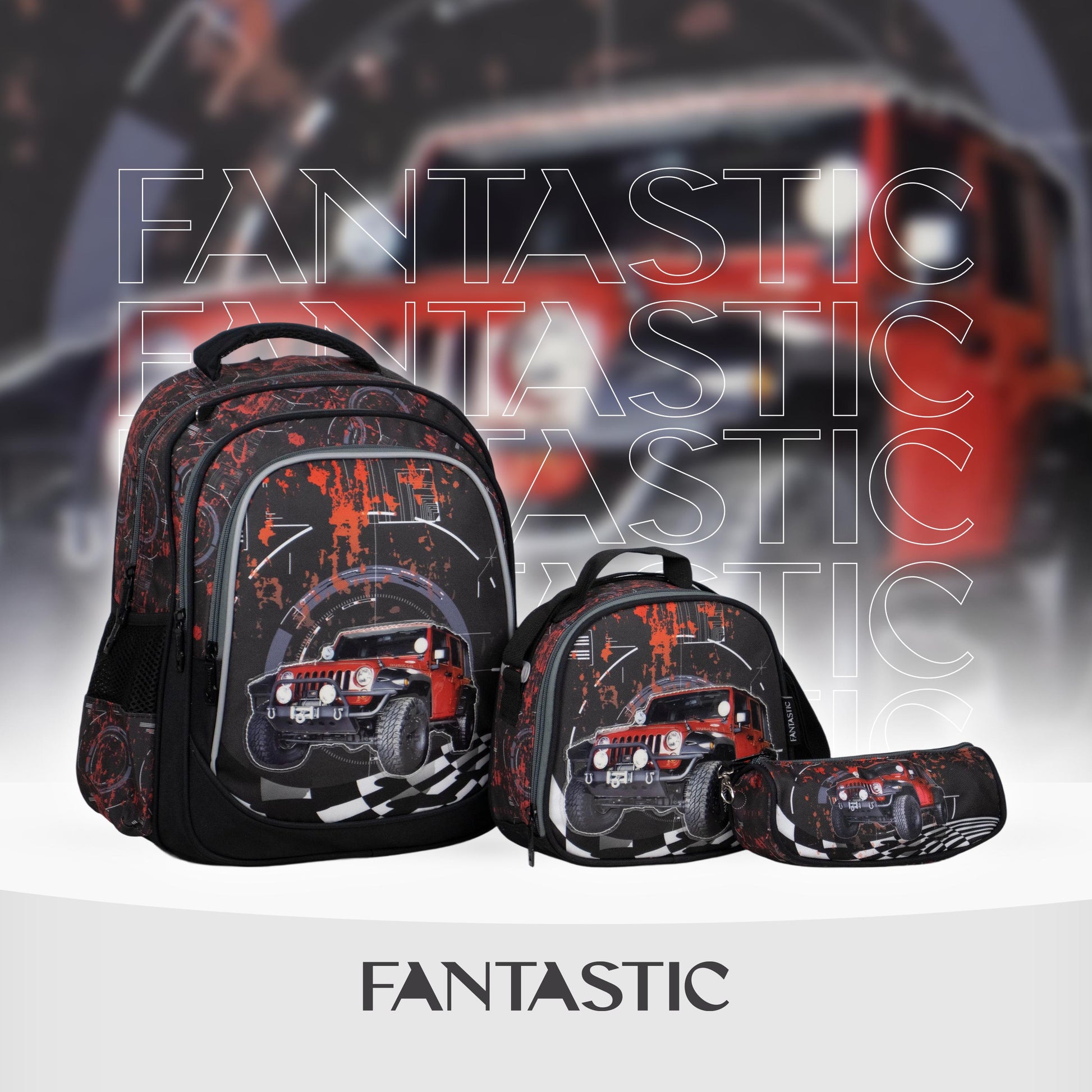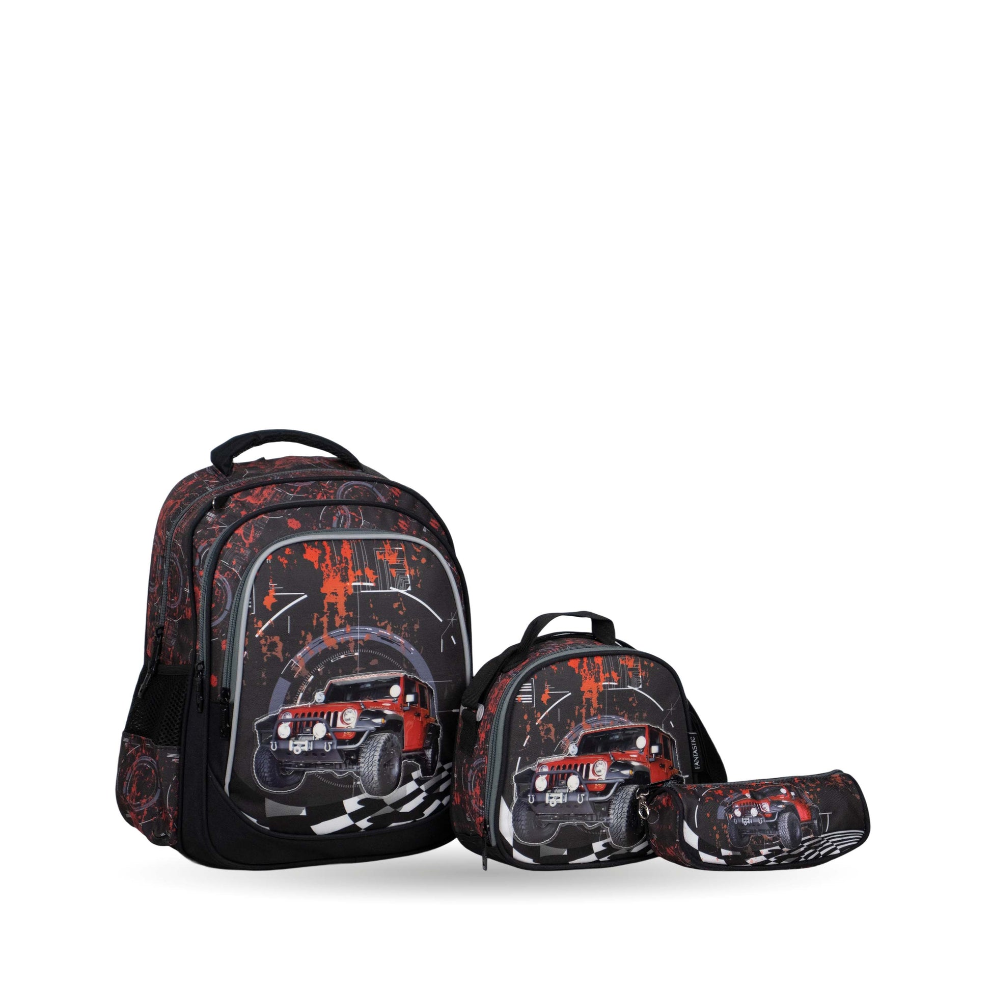 فانتاستيك، طقم حقائب مدرسية، ٣ قطع، تصميم سيارة، نمط أسود وأحمر XT082