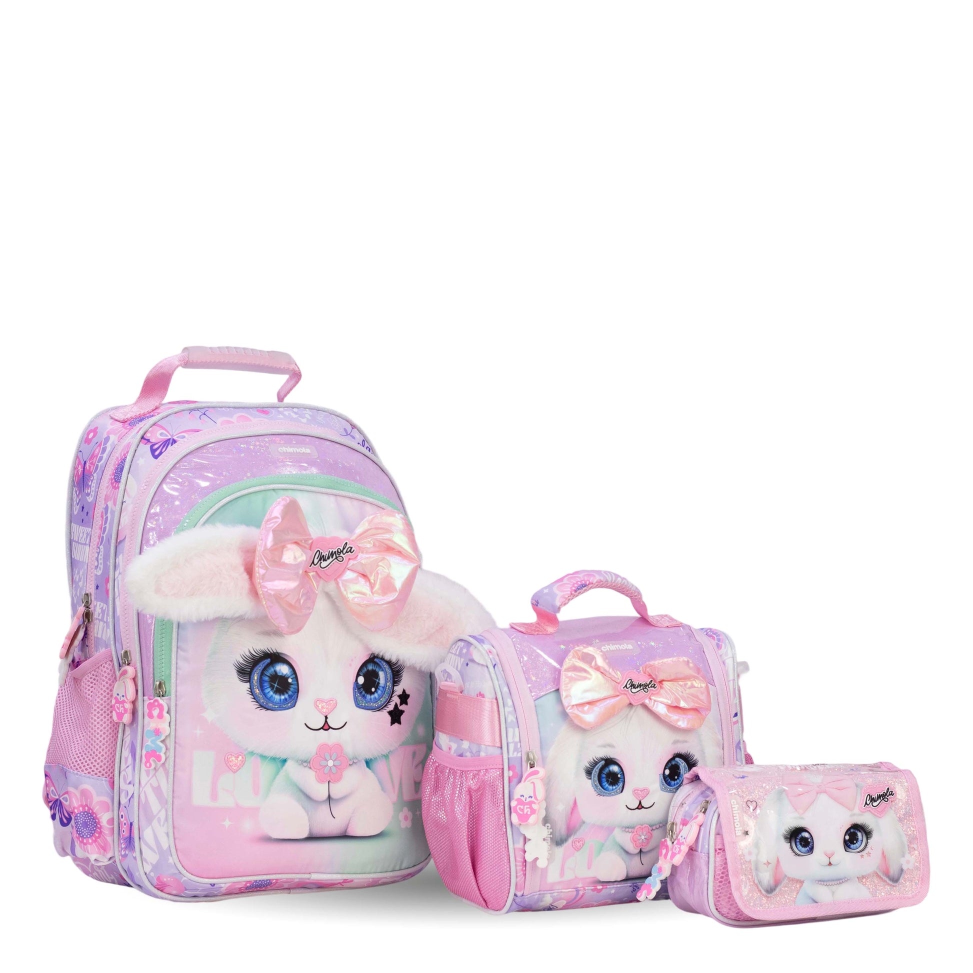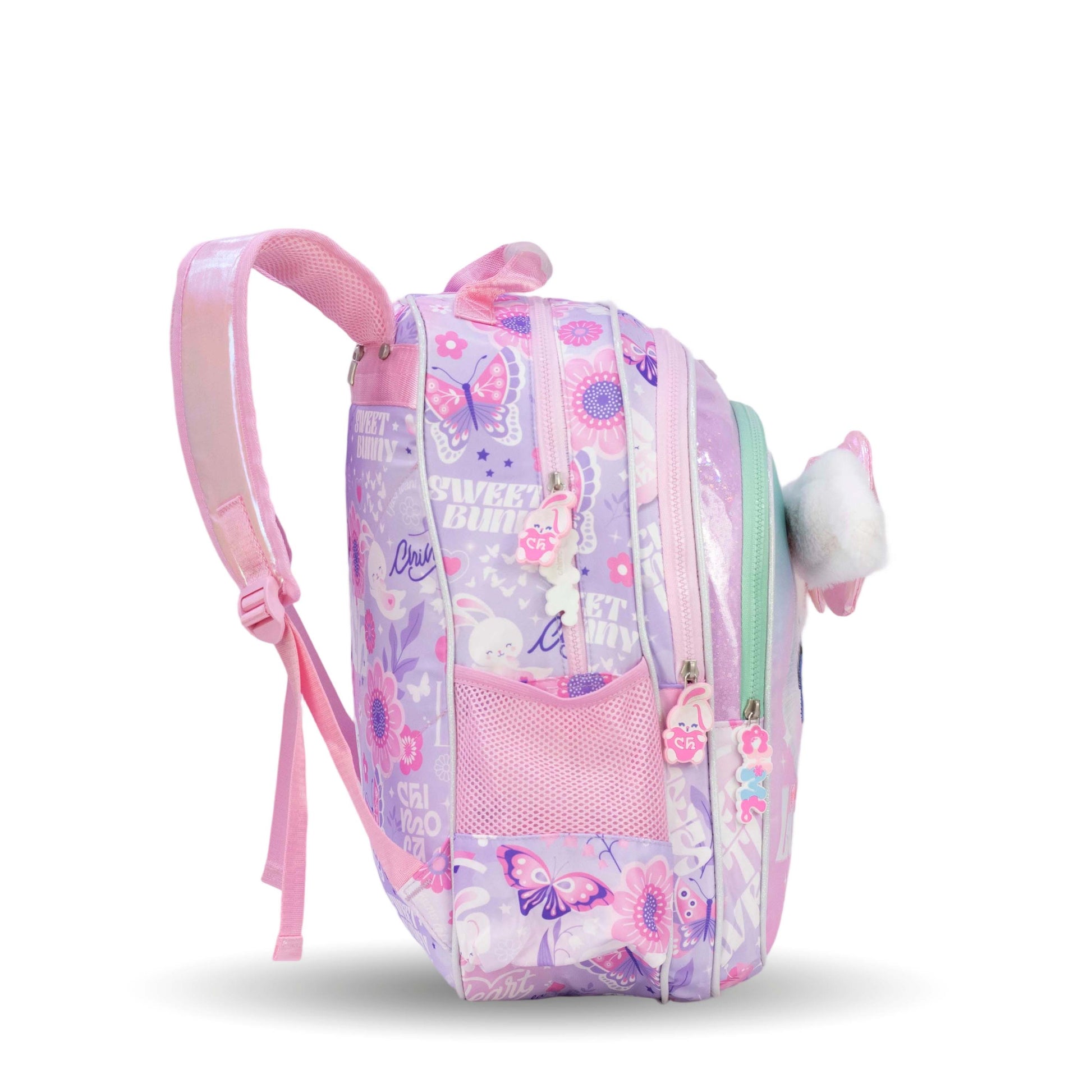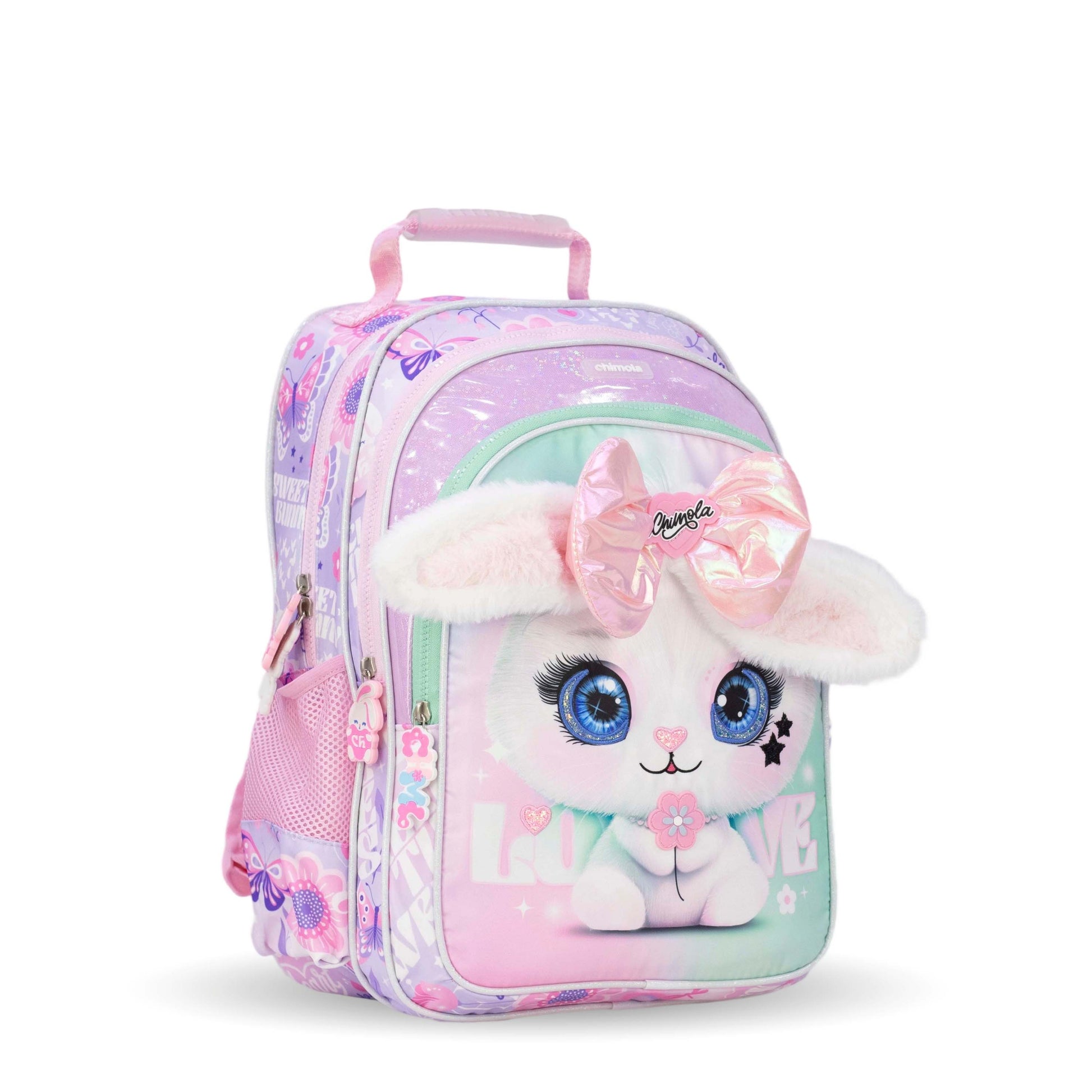 MM030 CHIMOLA ، طقم حقائب مدرسية للبنات، حقيبة ظهر مع حقيبة طعام ومقلمة، تصميم زهور وفراشات باللون الوردي والبنفسجي