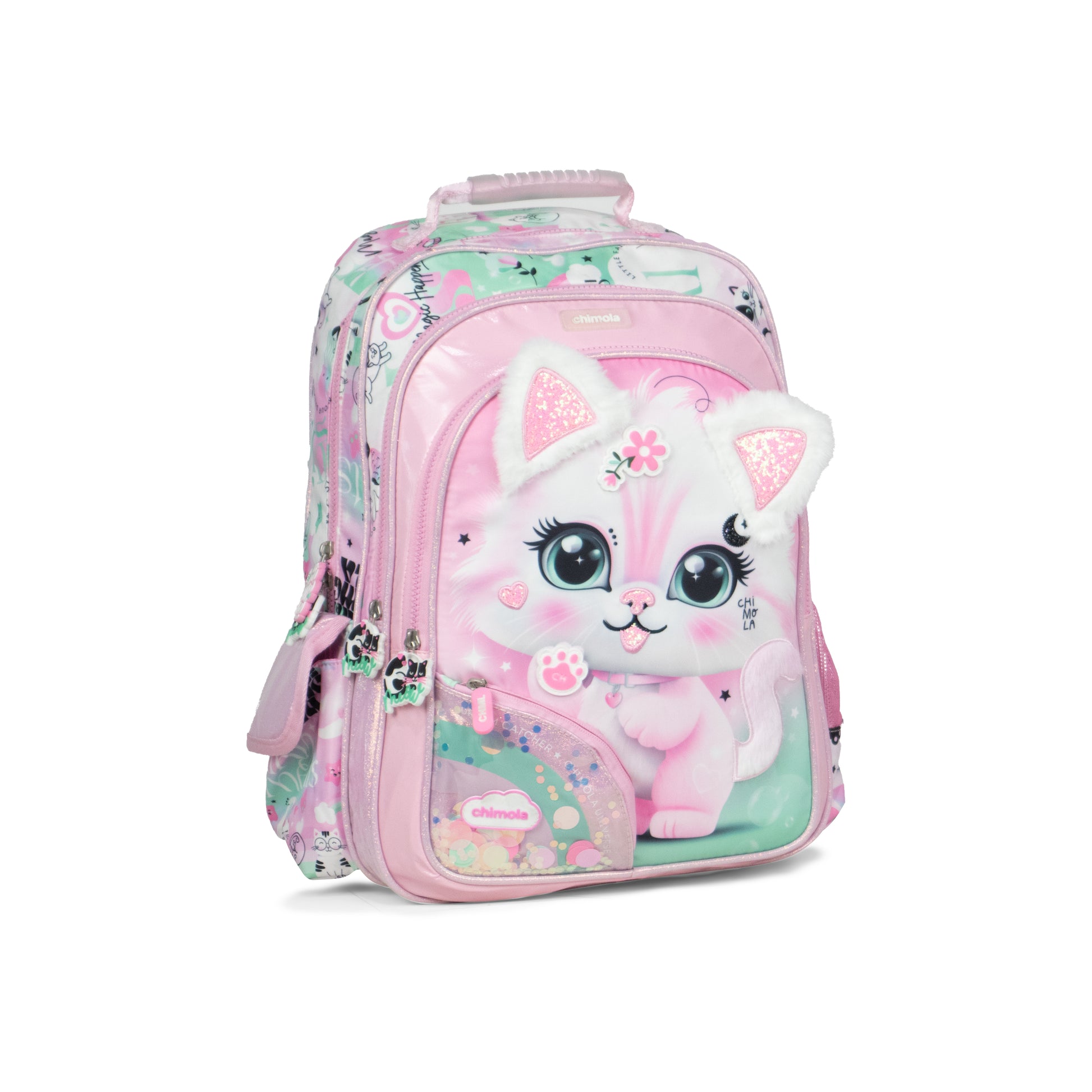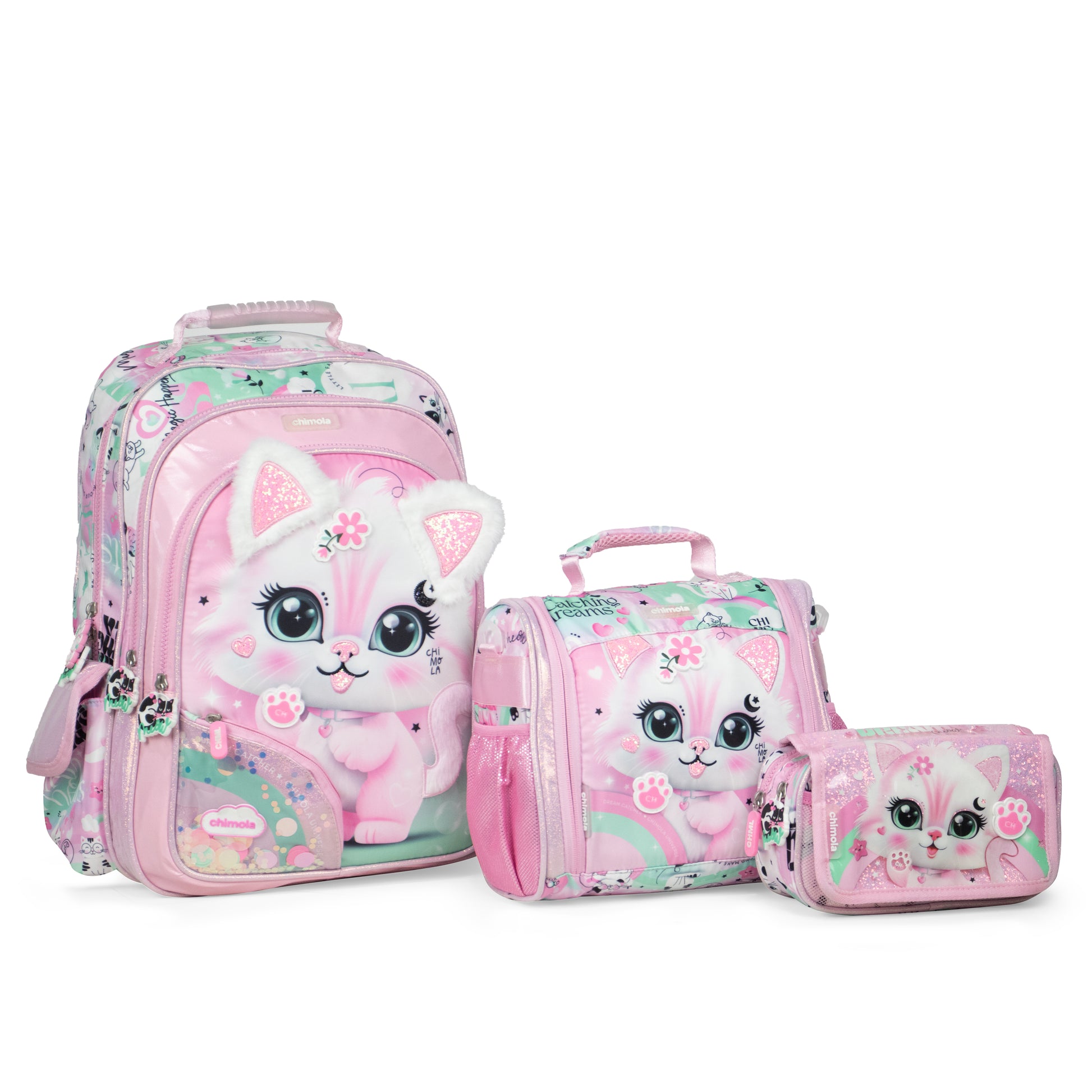 MM034 مجموعة حقائب أطفال بتصميم قطة، نمط وردي ومنت، 3 قطع