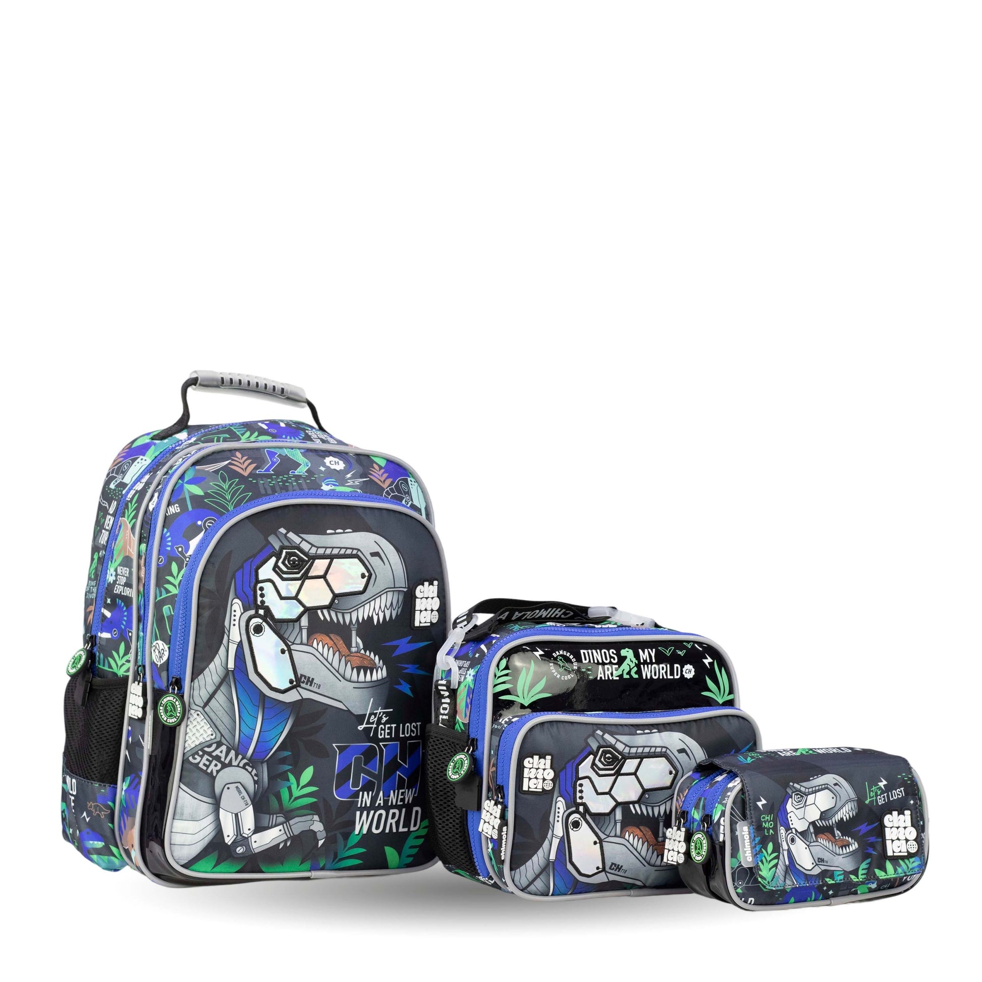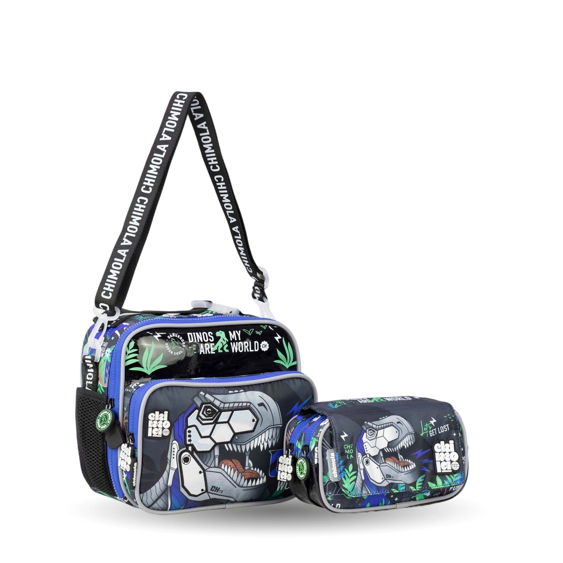 MM056 حقيبة ظهر مدرسية Chimola مع حقيبة طعام ومقلمة، تصميم ديناصور، أزرق وأخضر