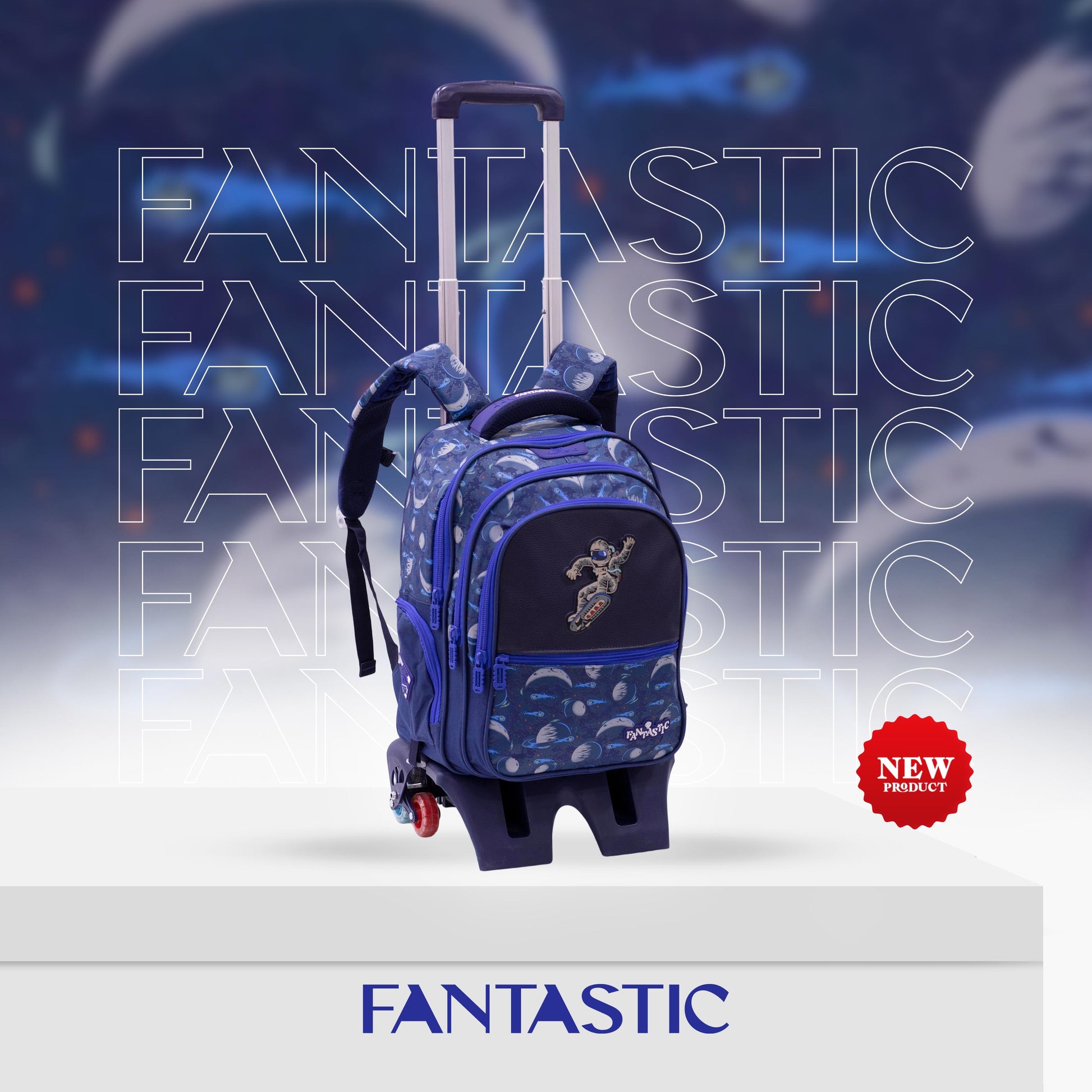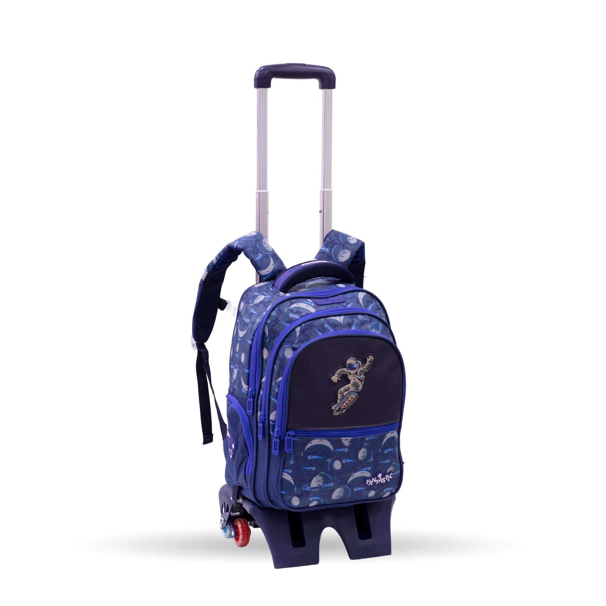 QY001T حقيبة ظهر مدرسية فضائية، مع عجلات، 3 حجرات، تصميم رائد فضاء وكواكب، أزرق داكن، مقاومة للماء