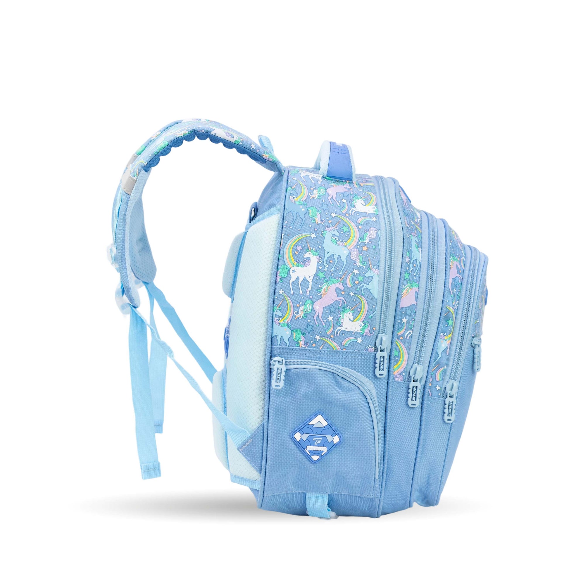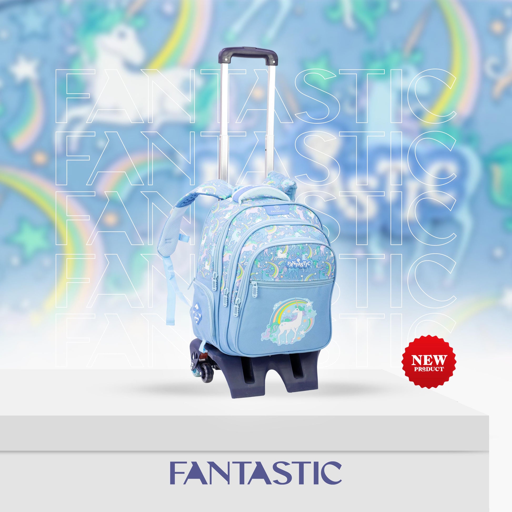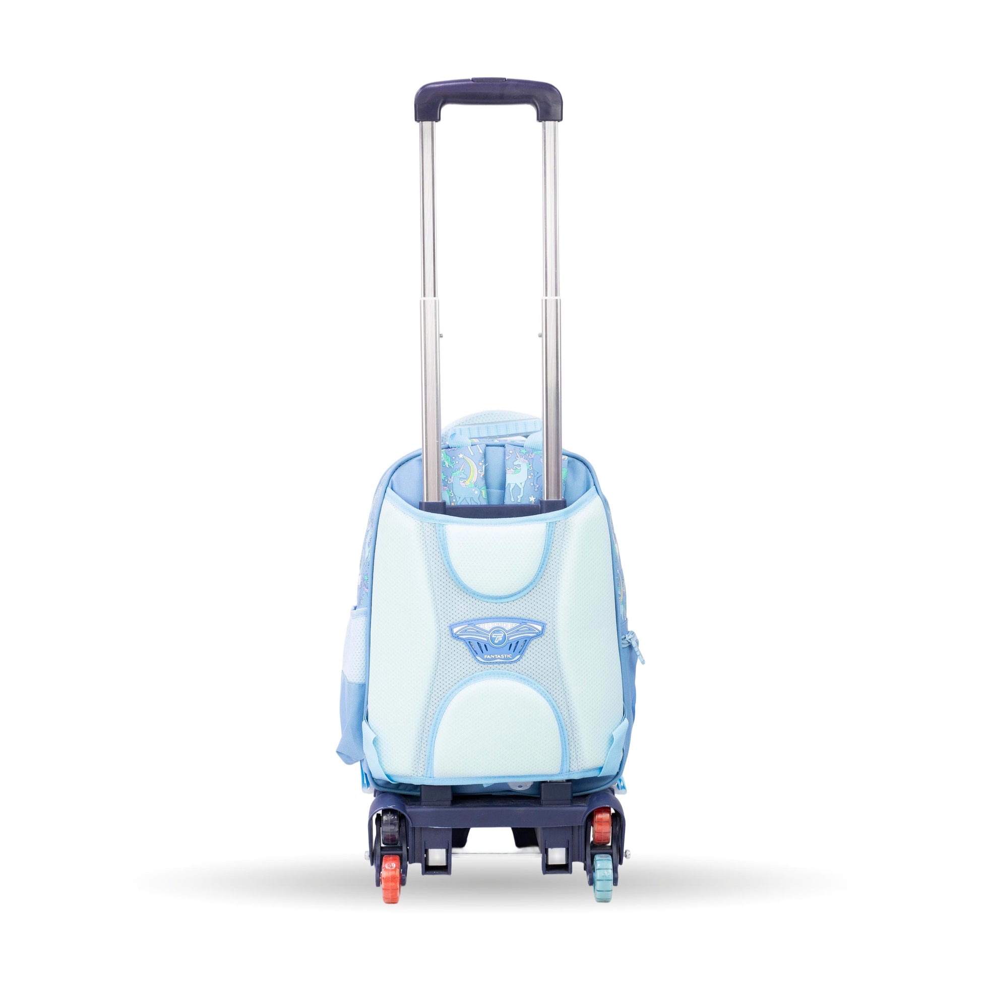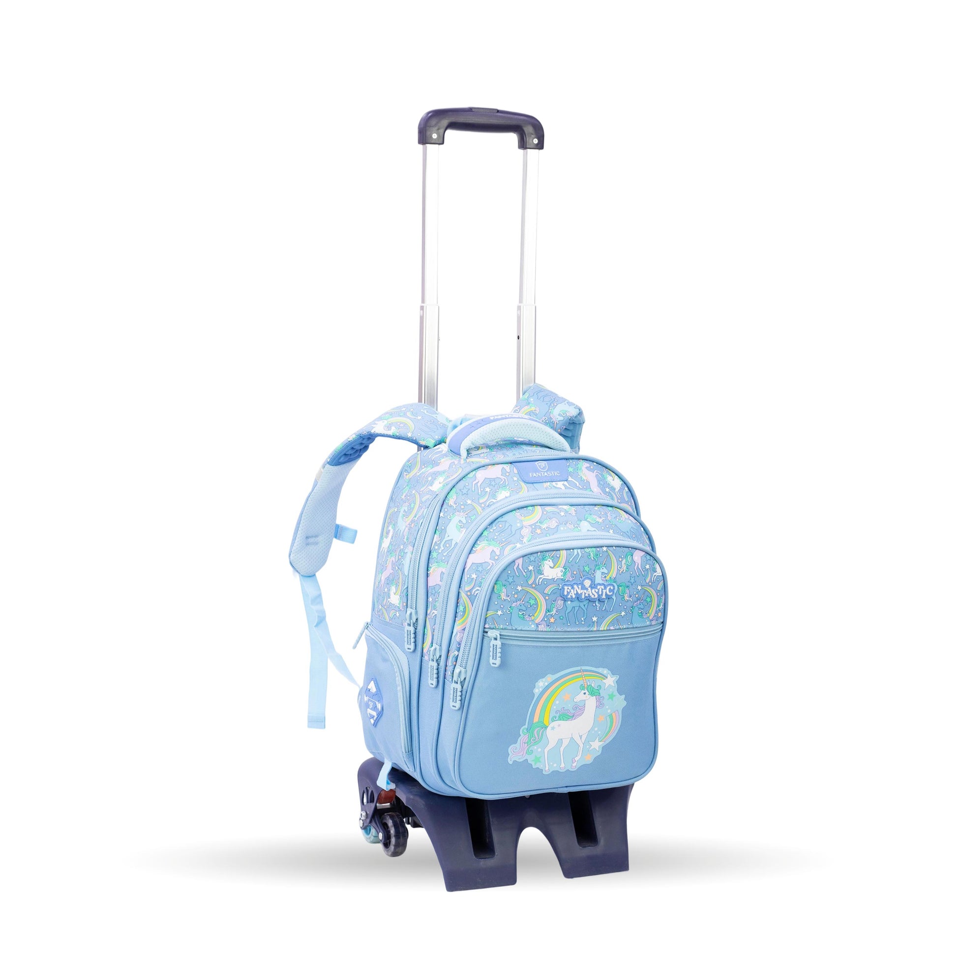QY002T فانتاستيك حقيبة ظهر مدرسية،مع عجلات تصميم يونيكورن وقوس قزح، لون أزرق فاتح، جيوب متعددة