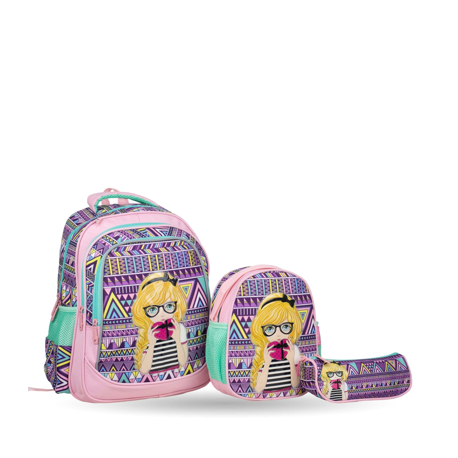 XT082 طقم شنط مدرسية للبنات، ٣ قطع، نمط هندسي، وردي وأرجواني